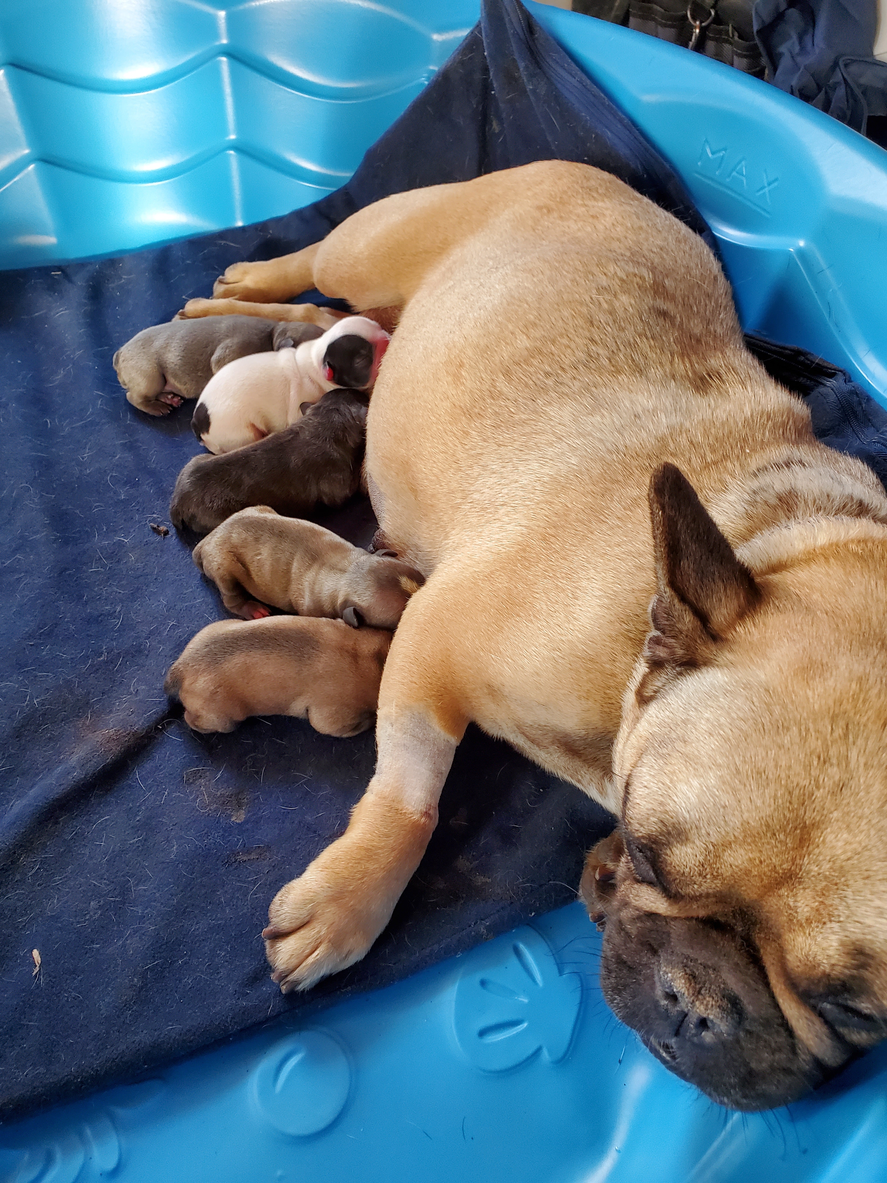We’ve got lots of babies around here at Dogwood Homestead, and more on the horizon. The last week of June found us running to the vet twice for c-sections… a Saturday the 25th for Sophie, who surprised us with 5 pups (4 live) – the x-rays had shown only ONE! Missy went in the following Monday, and out came 8 whopping pups! Sadly we lost 5 of that litter in the first crucial days when they are so fragile. Missy was a bit of a nervous mother at first, not holding still to let the pups nurse. By now she has figured it out and is being a great mama to her remaining 3 pups.