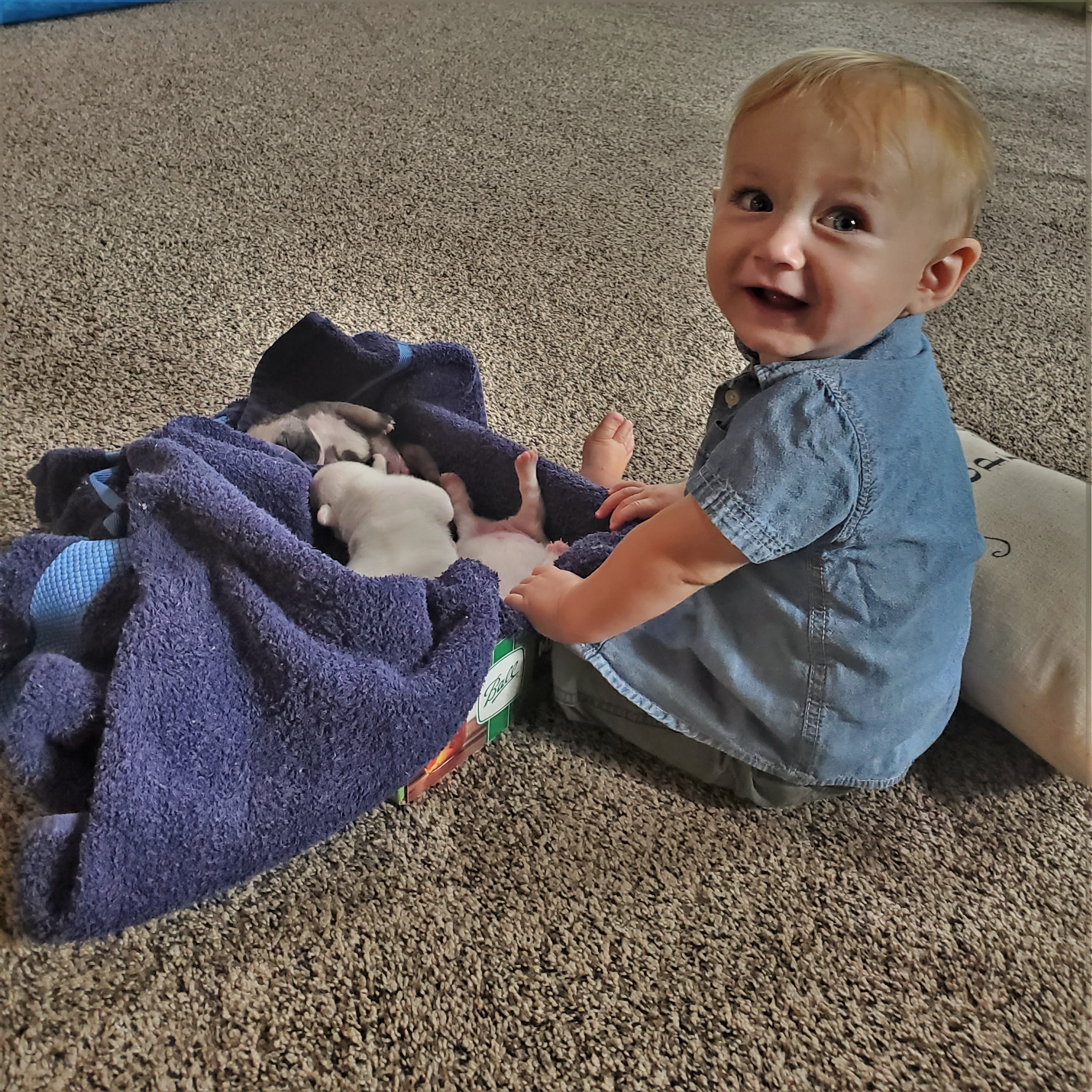 Our son Zeb turned one on July 3. He loves the pups but needs lots of supervision with them. We are excited to announce that Zeb will have a sibling in January of 2023!